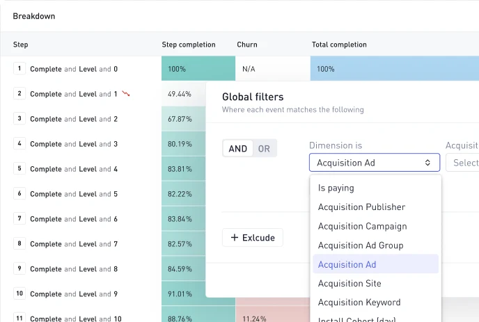Go beyond installs. Use Funnels to see how different campaigns affect retention, engagement and monetization. Filter by campaign, creative and more for a holistic view of your marketing efforts.